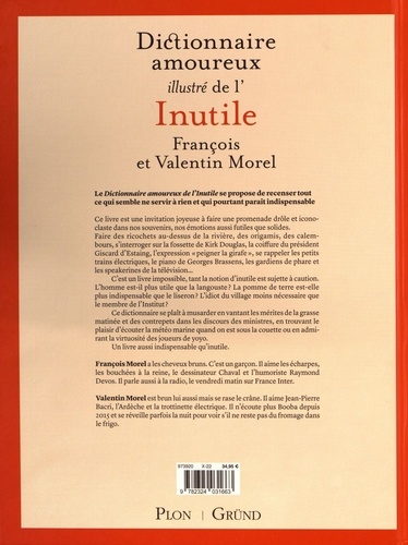 Le Dictionnaire amoureux de l'Inutile se propose de recenser tout ce qui semble ne servir à rien et qui pourtant paraît indispensable Ce livre est une invitation joyeuse à faire une promenade drôle et iconoclaste dans nos souvenirs, nos émotions aussi futiles que solides. Faire des ricochets au-dessus de la rivière, des cocottes en papier, des canulars, s'interroger sur la fossette de Kirk Douglas, la coiffure du président Giscard d'Estaing, l'expression "peigner la girafe", se rappeler les petits trains électriques, la guitare de Tino Rossi, les télégrammes de première et les speakerines de la télévision... C'est un livre impossible, tant la notion d'inutile est sujette à caution. L'homme est-il plus utile que la langouste ? La pomme de terre est-elle plus indispensable que le liseron ? L'idiot du village moins nécessaire que le membre de l'Institut ? Ce dictionnaire se plaît à musarder en vantant les mérites de la grasse matinée et des contrepets dans les discours des ministres, en trouvant le plaisir d'écouter la météo marine quand on est sous la couette ou en admirant la virtuosité des joueurs de yoyo. Un livre aussi indispensable qu'inutile.