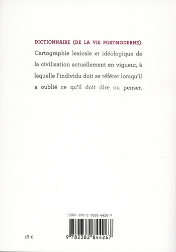 Dans la tradition de l'humour noir, de Flaubert à Ambrose Bierce et Pierre Desproges, ce dictionnaire se lit comme une radiographie jubilatoire de notre société contemporaine. L'objectif : décrire le monde comme l'ornithologue décrit les oiseaux : avec rigueur, distance, étonnement – crainte et incompréhension parfois, mais surtout : sans jugement. Les entrées se présentent comme autant d'aphorismes mordants et visionnaires sur la condition humaine, tantôt émaillées d'illustrations et de légendes. ACTIVISME. Divertissement de l'électorat de gauche. ADOLESCENCE. Maladie infantile causée par les perturbateurs endocriniens. APOLITISME. Pudeur de l'électorat de droite. AVENIR. Encore disponible, mais en stock limité. BIODEGRADABLE. Etat rêvé de la matière. BOURGEOIS. Tous les autres sont bourgeois. Pas moi. COLLAPSOLOGIE. Fonctionnarisation du nihilisme. COMPETITION. Forme actuelle du contrat social. MASQUE. Tout le monde en porte un. MORT. Tout le monde va mourir, sauf Elon Musk. OUBLI. Condition sine qua non de la vie postmoderne, sans quoi celle-ci devient insupportable.