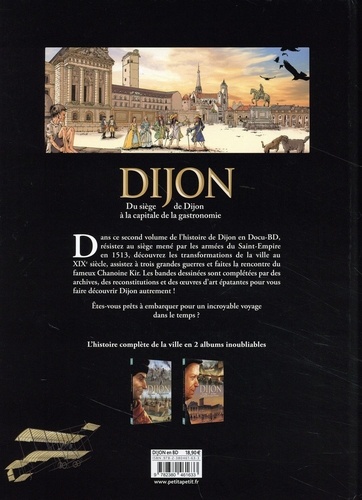 Il est temps de refermer la page de l'histoire de Dijon en Docu-BD. Dans cet opus, le lecteur résistera au siège de la ville mené par les armées du Saint-Empire en 1513, découvrira les transformations de la ville au XIXe siècle, assistera à deux guerres mondiales et fera la rencontre du célèbre Chanoine Kir. Les chapitres dessinés par des auteurs locaux sont accompagnés de pages documentaires qui prolongent la découverte de l'histoire de la ville.