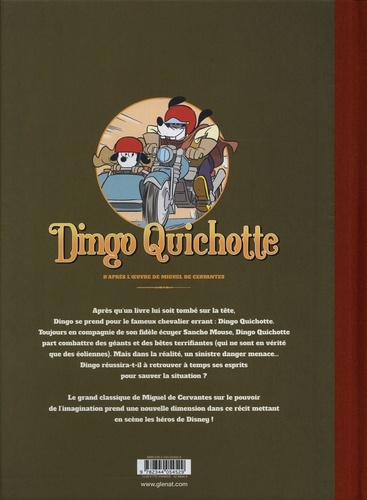 Retrouvez Dingo et Mickey dans une adaptation Disney du roman classique de Miguel de Cervantes ! Dingo s'occupe d'un magasin de bandes dessinées mais ne se soucie guère des histoires fantastiques qu'il vend. Mickey, quant à lui, est un commerçant enthousiaste qui se réjouit de la prochaine nouveauté. Lorsqu'une boîte de bandes dessinées frappe Dingo à la tête, il se réveille avec un cas de possession littéraire ! Le voilà dans la peau de Don Dingo de Castille ! A ses côtés, inquiet pour la santé de son ami, Mickey s'improvise Sanchito Mouse ! Ensemble, ils vont combattre des criminels, des géants et des bêtes, ainsi que des monstres mécaniques un peu singulier : les éoliennes ! Mais quelque chose de plus sinistre se cache sous la ville, une chose qui dépasse notre imagination ... Don Dingo de Castille et Sanchito Mouse trouveront-ils le moyen de revenir à la réalité pour combattre à temps ce nouveau mal ? Cette adaptation Disney du romancier espagnol Miguel de Cervantes nous fait redécouvrir une oeuvre majeure de la littérature avec le sourire et célèbre deux personnages phares dans une aventure rocambolesque, pleine d'humour et d'amitié.