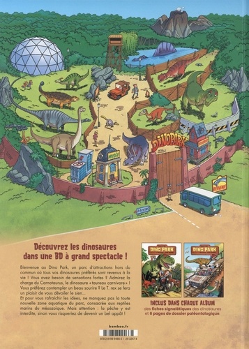 Découvrez les dinosaures dans une BD à grand spectacle ! Bienvenue au Dino Park, un parc d'attractions hors du commun où tous vos dinosaures préférés sont revenus à la vie ! Vous avez besoin de sensations fortes ? Admirez la charge du Carnotaurus, le dinosaure "taureau carnivore" ! Vous préférez contempler un beau sourire ? Le T. rex se fera un plaisir de vous dévoiler le sien... Et pour vous rafraîchir les idées, ne manquez pas la toute nouvelle zone aquatique du parc, consacrée aux reptiles marins du mésozoïque. Mais attention : la pêche y est interdite, sinon vous risqueriez de devenir un bel appât !