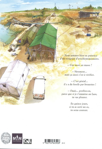 Les dinosaures du Paradis nous fait découvrir ce qui a amené Mazan, dessinateur de bande dessinée, à la paléontologie, et ce qu'est une fouille paléontologique, pendant une campagne de fouilles à Angeac-Charente alors que l'équipe de tournage de C'est pas sorcier filme les différents protagonistes du site. Cela permet d'expliquer au lecteur ce qu'est un chantier de fouilles, à quelle époque ont vécu les dinosaures, ce que l'on cherche et comment. Un avant-goût avant le voyage au Laos et la rencontre avec Ronan Allain, paléontologue au Muséum d'histoire naturelle de Paris, un des seuls paléontologues français en exercice et personnage central de ce livre. Le livre se termine avec cette mission au Laos à la découverte du squelette d'une nouvelle espèce de dinosaure : Ichthyovenator laosensis (à la crète étrange et échancrée) ! Avec ce récit aussi autobiographique que scientifique, le paléoartiste Mazan nous entraîne des rives de la Charente à la jungle du Laos à la découverte des dinosaures.