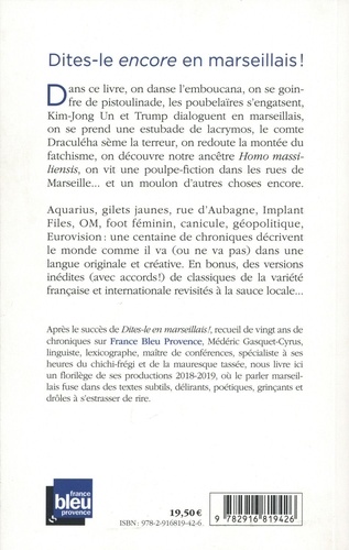 Dans ce livre, on danse l'emboucana, on se goinfre de pistoulinade, les poubelaïres s'engatsent, Kim-Jong Un et Trump dialoguent en marseillais, on se prend une estubade de lacrymos, le comte Draculéha sème la terreur, on redoute la montée du fatchisme, on découvre notre ancêtre Homo massiliensis, on vit une poulpe-fiction dans les mes de Marseille... et un moulon d'autres choses encore. Aquarius, gilets jaunes, rue d'Aubagne, Implant Files, OM, foot féminin, canicule, géopolitique, Eurovision : une centaine de chroniques décrivent le monde comme il va (ou ne va pas) dans une langue originale et créative. En bonus, des versions inédites (avec accords ! ) de classiques de la variété française et internationale revisités à la sauce locale...