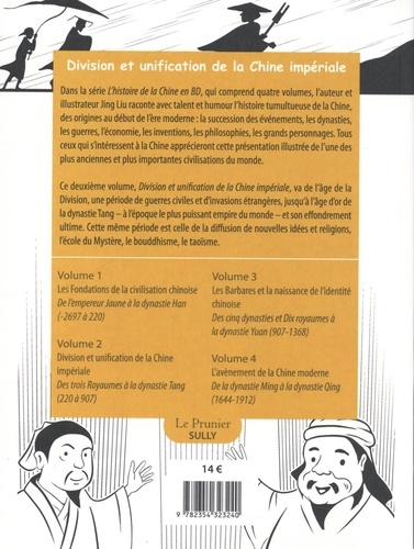Dans la série L'histoire de la Chine en BD, qui comprend quatre volumes, l'auteur et illustrateur Jing Liu raconte avec talent et humour l'histoire tumultueuse de la Chine, des origines au début de I ère moderne : la succession des événements, les dynasties, les guerres, l'économie, les inventions, les philosophies, les grands personnages. Tous ceux qui s'intéressent à la Chine apprécieront cette présentation illustrée de l'une des plus anciennes et plus importantes civilisations du monde. Ce deuxième volume, Division et unification de la Chine impériale, va de l'âge de la Division, une période de guerres civiles et d'invasions étrangères, jusqu'à l'âge d'or de la dynastie Tang - à l'époque le plus puissant empire du monde - et son effondrement ultime. Cette même période est celle de la diffusion de nouvelles idées et religions, l'école du Mystère, le bouddhisme, le taoïsme.