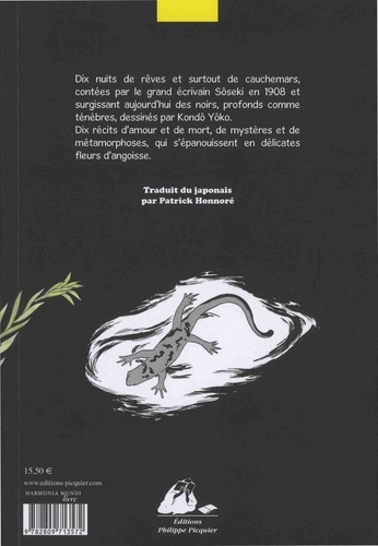 Dix nuits de rêves et surtout de cauchemars, contées par le grand écrivain Sôseki en 1908 et surgissant aujourd'hui des noirs, profonds comme ténèbres, dessinés par Kondô Yôko. Dix récits d'amour et de mort, de mystères et de métamorphoses, qui s'épanouissent en délicates fleurs d'angoisse.