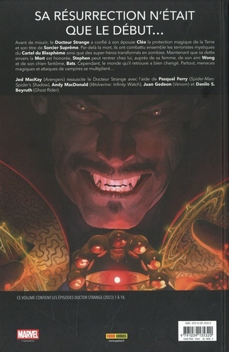 Avant de mourir, le Docteur Strange a confié à son épouse Cléa la protection magique de la Terre et son titre de Sorcier Suprême. Par-delà la mort, ils ont combattu ensemble les terroristes mystiques du Cartel du Blasphème ainsi que des super-héros transformés en zombies. Maintenant que sa dette envers la Mort est honorée, Stephen peut rentrer chez lui, auprès de sa femme, de son ami Wong et de son chien fantôme, Bats. Cependant, le monde qu'il retrouve a bien changé. Partout menaces magiques et attaques de vampires se multiplient... Jed MacKay (Avengers) ressuscite le Docteur Strange avec l'aide de Pasqual Ferry (Spider-Man : Spider's Shadow), Andy MacDonald (Wolverine : Infinity Watch), Juan Gedeon (Venom) et Danilo S. Beyruth (Ghost Rider).