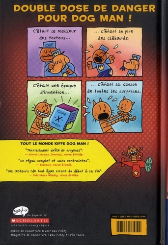 Une nouvelle grosse affaire pour Dog Man, le policier auquel on a greffé une tête de chien. Avec le retour d'un poisson psychopathe, d'un chat criminel, l'arrivée du fils de ce dernier et... des baballes à rapporter ! Dog Man parviendra-t-il à se tirer de ces mauvais pas sans rendre fou de rage son pauvre chef ? Vous le saurez en dévorant ce troisième volume de ses aventures, avec tout-tout plein de fliporamas et de rebondissements de dingue dedans ! Dav Pilkey, qui signe sous le nom de George Glousse et Harold Golade, est un maître de l'humour et de la narration. Avec son univers aussi frais que son graphisme est décomplexé, l'auteur américain continue de ravir petits et grands !