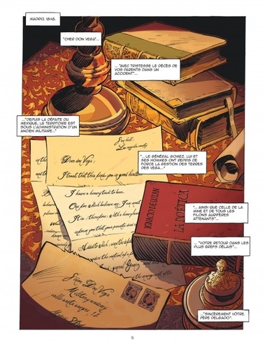 Madrid, 1848. Don Vega, héritier d'une riche famille californienne, reçoit une lettre lui annonçant le décès de ses parents. L'auteur du courrier, le père Delgado, l'incite à rentrer " dans les plus brefs délais ". A son retour, Don Vega découvre que le domaine familial est désormais géré par un ancien général, Gomez. Celui-ci s'appuie sur Borrow, une brute sadique et sans scrupules, pour mettre la Californie en coupe réglée en rachetant des terrains à bas prix afin de les revendre plus cher. Des peons ont le courage de se révolter. Le visage couvert d'une cagoule, ils se réclament d'" el Zorro ", un mythe populaire local. Le peuple les voit comme des héros. Don Vega décide de suivre leur exemple : il revêt un costume noir et est bien décidé à faire payer les spoliations commises envers sa famille. La légende de Zorro est en marche... Le personnage de Zorro renaît de ses cendres dans cette relecture enthousiasmante d'un classique de la culture populaire, né en 1919 dans un roman de Johnston McCulley avant d'être immortalisé par le cinéma et la série télévisée de Walt Disney.