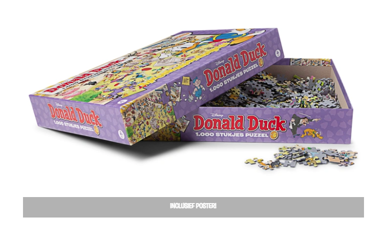 De Donald Duck Puzzelcollectie bestaat uit 8 verschillende puzzels van elk 1.000 stukjes. Spaar ze allemaal!