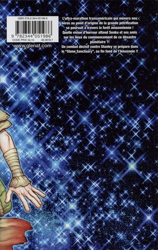 L'ultra-marathon transaméricain qui mènera nos héros au point d'origine de la grande pétrification se poursuit à travers la forêt amazonienne ! Quelle vision d'horreur attend Senku et ses amis sur les lieux du commencement de ce désastre planétaire ? ! Un combat décisif contre Stanley se prépare dans le "Stone Sanctuary", au fin fond de l'Amazonie !!
