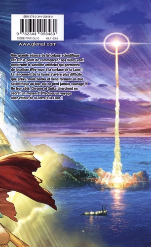 Une grande séance de bricolage scientifique est sur le point de commencer : nos héros vont construire le satellite artificiel qui permettra de localiser Why-man à la surface de la Lune ! Le lancement de la fusée s'avère plus difficile que prévu, mais Senku et Xeno forment un duo scientifique au top, qui ne perd jamais courage !! De leur côté, Chrome et Suika cherchent en secret un moyen d'effectuer un voyage aller-retour de la Terre à la Lune !