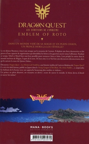 Une épopée Dark Fantasy 100% inédite dans l'univers de Dragon Quest ! Le roi démon Baramos a lancé une attaque sur le royaume de Carmen. Il déploie une force destructrice et fait preuve d'une capacité de régénération qui déstabilise les héros et les guerriers sacrés venus l'affronter. Pendant ce temps, Tyltyl et Mytyl font tout leur possible pour retrouver Aros et Aniss. Leur périple les mène dans le monde intérieur de Shigan, l'esprit de la terre. De leur côté, Li et Yui font une découverte déconcertante alors qu'ils suivent la trace de Quinn Zolma... Découvrez Dragon Quest - Les Héritiers de l'emblème une histoire inédite de l'univers fabuleux de Dragon Quest ! Ce récit de dark fantasy publié au Japon dans le Young Gangan (Übel Blatt, The Arms Peddler...) surprendra les habitués de la licence avec son approche beaucoup plus sombre et violente... Série terminée en 34 tomes