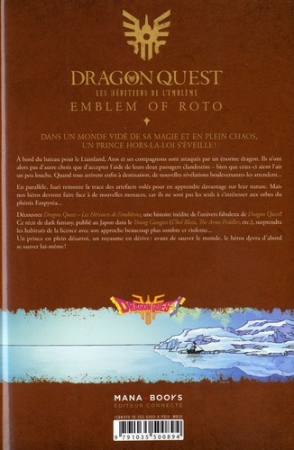 A bord du bateau pour le Liamland, Aros et ses compagnons sont attaqués par un énorme dragon. Ils n'ont alors pas d'autre choix que d'accepter l'aide de leurs deux passagers clandestins — bien que ceux-ci aient l'air un peu louche. Quand mus arrivent enfin à destination, de nouvelles révélations bouleversantes les attendent... En parallèle, Inari remonte la trace des artefacts volés pour en apprendre davantage sur leur nature. Mais nos héros devront faire face à de nouvelles menaces, car ils ne mot pm les seuls à s'intéresser aux orbes du phénix Empyréa. Découvrez Dragon Quest - Les Héritier de l'emblème, une histoire inédite de l'univers fabuleux de Dragon Quest ! Ce récit de dark fantasy, publié au Japon dans le Young Gangan (Ubel Blatt, The Arms Peddler, etc.) surprendra les habitués de la licence avec son approche beaucoup plus sombre et violente. Un prince en plein désarroi, un royaume en dérive : avant de sauver le monde, le héros devra d'abord se sauver lui-même !
