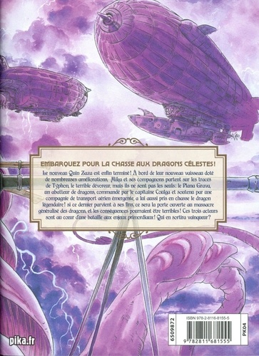 Le nouveau Quin Zaza est enfin terminé ! A bord de leur nouveau vaisseau doté de nombreuses améliorations, Mika et ses compagnons partent sur les traces de Typhon, le terrible dévoreur, mais ils ne sont pas les seuls : le Plana Grava, un abatteur de dragons, commandé par le capitaine Coulga et soutenu par une compagnie de transport aérien émergente, a lui aussi pris en chasse le dragon légendaire ! si ce dernier parvient à ses fins, ce sera la porte ouverte au massacre généralisé des dragons, et les conséquences pourraient être terribles ! Ces trois acteurs sont au coeur d'une bataille aux enjeux primordiaux ! Qui en sortira vainqueur ?