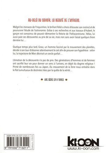 Au-delà du savoir, la beauté de l'univers ! Malgré les menaces de l'Inquisition, le brillant Rafal a choisi d'écouter son instinct et de poursuivre l'étude de l'astronomie. Grâce à ses recherches et aux travaux d'Hubert, le garçon est convaincu de pouvoir démontrer la théorie de l'héliocentrisme. Hélas, lui aussi paie ses découvertes au prix de sa vie, mais non sans avoir laissé quelque chose derrière lui... Quelque temps plus tard, Grasz, un homme fasciné par le mouvement des planètes, décide à son tour d'observer attentivement le ciel afin de prouver son hypothèse : selon lui, la trajectoire de Mars décrirait un cercle parfait... L'émotion de la découverte n'a pas de prix. Des générations d'hommes et de femmes ont sacrifié leur vie pour donner un sens à l'univers, en dépit du dogme religieux ! Primé de nombreuses fois au Japon, Du mouvement de la Terre nous entraîne dans le flot tumultueux de destinées liées par la quête de la vérité...