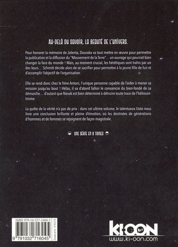 Au-delà du savoir, la beauté de l'univers ! Pour honorer la mémoire de Jolenta, Douraka va tout mettre en oeuvre pour permettre la publication et la diffusion du °Mouvement de la Terre"... un ouvrage qui pourrait bien changer la face du monde ! Mais, au moment crucial, les hérétiques sont trahis par un des leurs... Schmitt décide alors de se sacrifier pour permettre à la jeune fille de fuir et d'accomplir l'objectif de l'organisation. Elle se rend donc chez le frère Antoni, l'unique personne capable de l'aider à mener sa mission jusqu'au bout ! Hélas, il va d'abord falloir le convaincre du bien-fondé de sa démarche... d'autant que Novak est bien déterminé à détruire toute trace de l'héliocentrisme. La quête de la vérité n'a pas de prix : dans cet ultime volume, le talentueux Uoto nous livre une conclusion brillante et pleine d'émotion où les destinées de générations d'hommes et de femmes se rejoignent de façon magistrale.