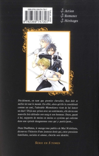 Décidément, en tant que premier chevalier, Ran doit se méfier de tout le monde. En effet, alors qu'elle le considérait comme un ami, l'adorable Momokawa vient de lui lancer un duel ! Déjà aux prises avec ses sentiments, elle devra une nouvelle fois défendre son rang et son honneur. Ibara, quant à lui, supporte de moins en moins ce système qui enferme dans une spirale dangereuse ceux qui y participent... Dans Duellistes, le manga tous publics de Mai Nishikata, découvrez l'histoire d'une jeunesse dorée qui, entre pressions familiales, sociales et amour, cherche son identité.