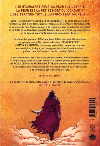 DUNE, le chef d'oeuvre absolu de FRANK HERBERT, se situe dans un avenir lointain, au sein d'une tentaculaire et féodale société interstellaire. Il raconte la destinée de Paul Atréides à partir du moment où lui et sa famille acceptent le contrôle de la désertique planète. Arrakis, seule source de la plus précieuse et de la plus importante substance du cosmos : l'épice. Publiée à l'origine en 1965 et à présent fidèlement adaptée en roman graphique, par le fils même de l'auteur, BRIAN HERBERT, et KEVIN J. ANDERSON, cette saga explore les complexes relations entre religion, écologie, technologie et émotions humaines alors que les clans s'affrontent pour le contrôle d'Arrakis. Cet étonnant mélange d'aventure, de mysticisme, d'environnementalisme et de politique, est maintenant retranscrit comme jamais grâce aux dessins de RAÚL ALLEN et de PATRICIA MARTÍN, donnant une nouvelle incarnation à ce puissant conte fantastique et l'offrant à découvrir ou à redécouvrir à de nouvelles génération de lecteurs.