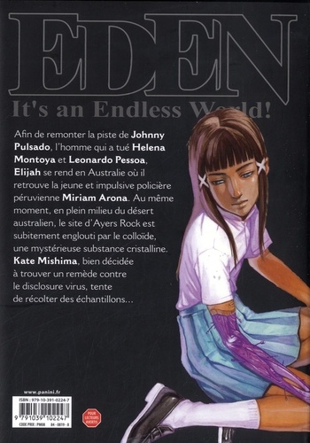 Pour venger la mort de Leonardo et d'Helena, Elijah, Miriam et Mac se rendent en Australie où les recherches sur l'effroyable "disclosure virus" réservent bien des surprises ! Elijah est escorté par l'impressionnante Aletheia, une nouvelle génération d'intelligence artificielle. Cette mission va le remettre par hasard sur la piste de sa soeur Mana... Hiroki Endo propose avec Eden, un manga d'anticipation, inspiré du mouvement cyberpunk. Récit à suspense, plein de scènes d'action entraînantes, Eden est violent et cru mais offre aussi certains passages empreints de mélancolie qui ne laissent pas le lecteur insensible. Mélange des genres, ce manga évoque des récits de guerre, le terrorisme, une pandémie... des thèmes ancrés dans notre réalité.