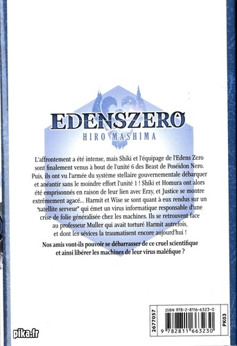 L'affrontement a été intense, mais Shiki et l'équipage de l'Edens Zero sont finalement venus à bout de l'unité 6 des Beast de Poséidon Nero. Puis, ils ont vu l'armée du système stellaire gouvernementale débarquer et anéantir sans le moindre effort l'unité 1 ! Shiki et Homura ont alors été emprisonnés en raison de leur lien avec Erzy, et Justice se montre extrêmement agacé... Harmit et Wise se sont quant à eux rendus sur un "satellite serveur" qui émet un virus informatique responsable d'une crise de folie généralisée chez les machines. Ils se retrouvent face au professeur Muller qui avait torturé Harmit autrefois, et dont les sévices la traumatisent encore aujourd'hui ! Nos amis vont-ils pouvoir se débarrasser de ce cruel scientifique et ainsi libérer les machines de leur virus maléfique ?