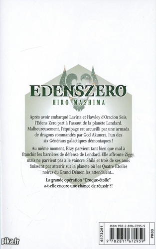 Après avoir embarqué Laviria et Hawley d'Oracion Seis, l'Edens Zero part à l'assaut de la planète Lendard. Malheureusement, l'équipage est accueilli par une armada de dragons commandés par God Akunera, l'un des six Généraux galactiques démoniaques ! Au même moment, Erzy parvient tant bien que mal à franchir les barrières de défense de Lendard. Elle affronte Ziggy, mais ne parvient pas à le vaincre. Shiki et trois de ses amis finissent par atterrir sur la planète où les Quatre Etoiles noires du Grand Démon les attendaient... La grande opération "Croque-étoile" a-t-elle encore une chance de réussir ? !
