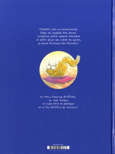 Elizabeth, une petite fille vampire, veut très fort un Poney-licorne ! Elle rencontre Diego, petit garçon capricieux à la main droite artificielle. Entre deux bêtises et trois catastrophes, une improbable amitié va naître entre ces deux-là. Une nouvelle série jeunesse, pleine d'humour et de fantaisie, au rythme endiablé. Dessin à la Sempé d'Arthur du Coteau et scénario vitaminé de Swann Méralli, qui signent ici leur premier album chez Dargaud.