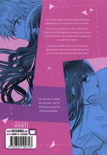 Lors d'une soirée de festival d'été, Nachi se balade avec une ravissante Yûri en kimono. Alors qu'il souhaitait au début garder leur relation secrète, Nachi commence petit à petit à vouloir montrer au monde entier à quel point sa copine est canon. Il l'invite à passer chez lui et rencontrer ses parents, mais ces derniers sont en fait sortis. Il se retrouve donc seul avec elle... Un volume 4 plein de douceur de fin d'été aux accents mélancoliques...