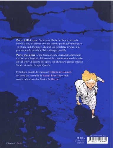 Deux histoires se déroulent en parallèle : celle de Julia américaine qui vit à Paris, en 2000, avec son mari Bertrand et sa fille Zoë et celle de Sarah déportée avec son père et sa mère, en 194, 2 lors de la rafle du Vel' D'Hiv'. Les deux récits se rejoignent malgré les années qui les séparent. Paris, juillet 1942 : Sarah, une fillette de dix ans qui porte l'étoile jaune, est arrêtée avec ses parents par la police française, au milieu de la nuit. Paniquée, elle met son petit frère à l'abri en lui promettant de revenir le libérer dès que possible. Paris, mai 2002 : Julia Jarmond, une journaliste américaine mariée à un Français, doit couvrir la commémoration de la rafle du Vél d'Hiv. Soixante ans après, son chemin va croiser celui de Sarah, et sa vie va changer à jamais. Elle s'appelait Sarah, est l'histoire de deux familles que lie un terrible secret, c'est aussi l'évocation d'une des pages les plus sombres de l'Occupation. Le roman de Tatiana de Rosnay est porté par le souffle de Pascal Bresson et revit sous la délicatesse des dessins de Horne.