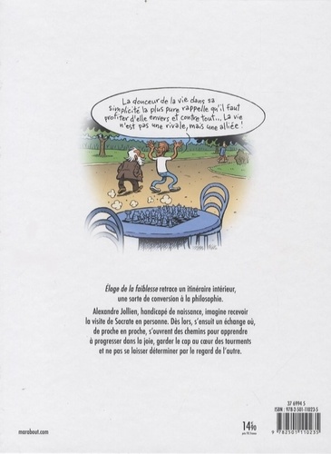 Pour passer le temps, Alexandre Jollien, handicapé depuis sa naissance, s'invente un dialogue avec Socrate. Au travers de cet échange il nous conte de façon directe, drôle et parfois brutale sa jeunesse passée en institut spécialisé. « Éloge de la faiblesse » est tout autant une tranche de vie qu'un parcours initiatique et philosophique : c'est un savant mélange d'humilité, de sagesse et d'irrévérence ! Depuis une vingtaine d'années, la bande dessinée est capable de tout. De tout dire. De tout montrer.Si le texte est emprunté, mot pour mot, à l'œuvre originale d'Alexandre Jollien, la BD a été totalement redécoupée et séquencée en une série de tableaux, qui rendent la lecture extrêmement fluide et possiblement aléatoire.Le choix affirmé d'un style graphique, non réaliste, très éloigné de la réalité, permet d'éviter tout voyeurisme, toute complaisance et surtout toute censure, voire pire, toute autocensure. Eric Corbeyran, scénariste à succès, et Nicolas Tabary, dessinateur de renom, se sont lancés dans l'adaptation de ce texte à corps perdus.Mettre en scène le travail d'un auteur n'est jamais simple, mais lorsqu'il s'agit de mettre en image le génie et la sensibilité d'Alexandre Jollien c'est encore plus compliqué. Et pourtant… Le résultat est là : une BD riche d'émotions, une BD riche de la faiblesse de ses auteurs.