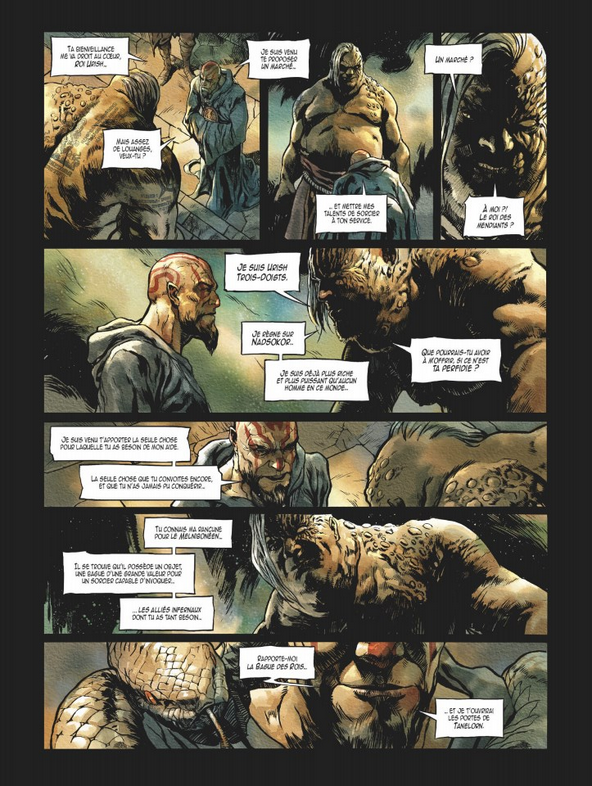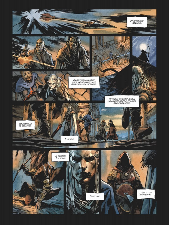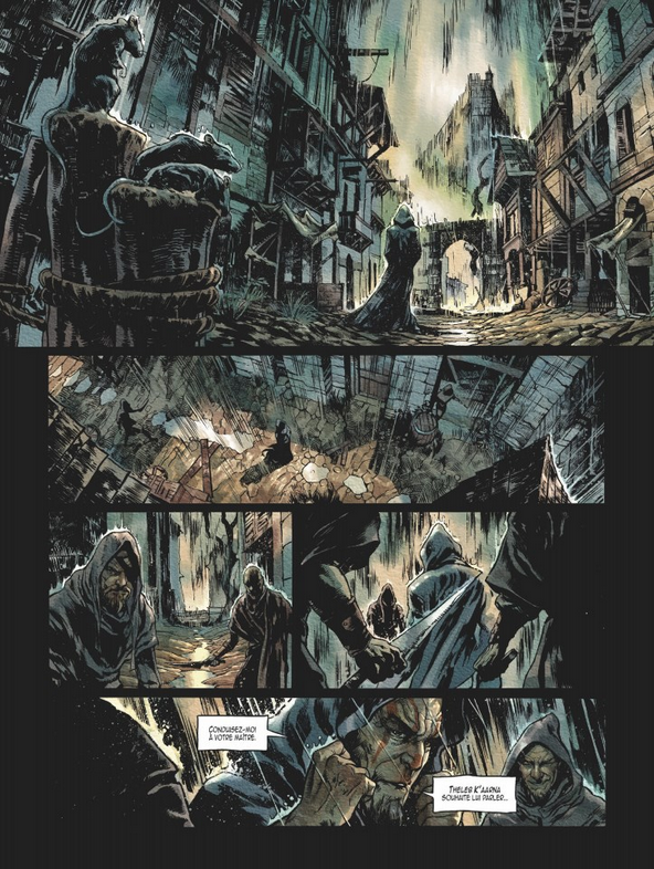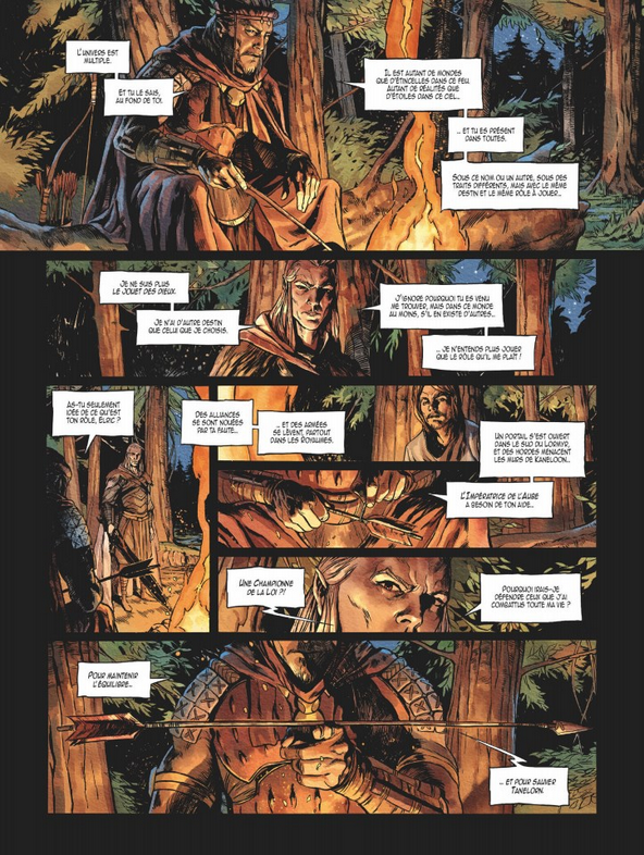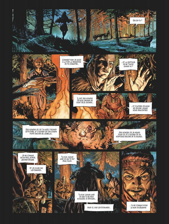 Comment trouver la paix au milieu du chaos ? Elric continue d'errer sans but de ports en auberges aux côtés de Tristelune, sans se douter que, dans l'ombre, Theleb K'aarna convoite l'Actorios, la puissante Bague des Rois, talisman mythique des seigneurs de Melniboné que possède le prince albinos déchu. Blessé dans son orgueil, le puissant sorcier de Pan Tang rêve en effet d'anéantir Elric en le privant de tout ce qui lui est cher : le soutien d'Arioch, son épée Stormbringer et son désir de paix et de rédemption. Theleb s'allie pour cela à Urish-Trois-Doigts, le roi des mendiants de Nadsokor... Elric, quant à lui, croise la route d'un énigmatique poursuivant, Rackhir l'Archer rouge - sur ses traces depuis longtemps, à l'insu du melnibonéen. Rackhir prétend avoir déjà rencontré Elric sur un autre plan d'existence. Il initie le prince albinos aux dimensions parallèles du Multivers et lui révèle l'existence de la cité de Tanelorn, qui est le havre de paix que celui-ci appelle de ses voeux. Mais atteindre Tanelorn se mérite, et Elric va d'abord devoir secourir Myshella, une Championne de la Loi en péril... La saga tragique d'Elric se poursuit avec ce nouvel épisode, confirmant une fois de plus son statut de référence incontournable de la bande dessinée de dark fantasy ! L'oeuvre culte de Michael Moorcock, plébiscitée par le public et la critique nous ensorcelle à travers ce second cycle, toujours respectueusement adapté avec une interprétation visuelle magistrale signée Valentin Sécher.