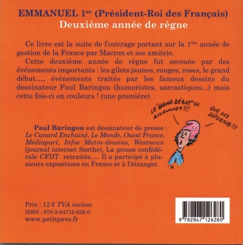 Ce livre est la suite de l'ouvrage portant sur la 1ère année de gestion de la France par Macron et ses ami(e)s. Cette deuxième année de règne fut secouée par des événements importants : les gilets jaunes, rouges, roses, le grand débat..., événements traités par les fameux dessins du dessinateur Paul Baringou (humoristes, sarcastiques...) mais cette fois-ci en couleurs ! (une première).