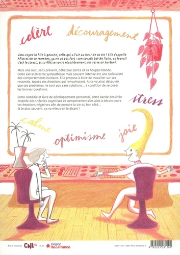 " Découragée. " Entre le stress du travail, sa fille qui entre à l'école et ses doutes sur sa vie de couple, Alice est au bout de sa vie. Mais une nuit, shazam : Zorica sonne à sa porte. Cette amusante créature extraterrestre, pleine d'énergie et d'ondes positives, est une spécialiste des comportements humains qui va expliquer à Alice comment se manifestent les émotions... et surtout : quelles solutions existent pour aller mieux et se sentir bien ! Reprenant avec humour les codes des livres de développement personnel, Sandrine Martin tend un miroir réjouissant qui nous invite à nous interroger avec les personnages : comment comprendre nos sensations ? Et comment mieux les accueillir afin de surmonter les inévitables doutes du quotidien ?