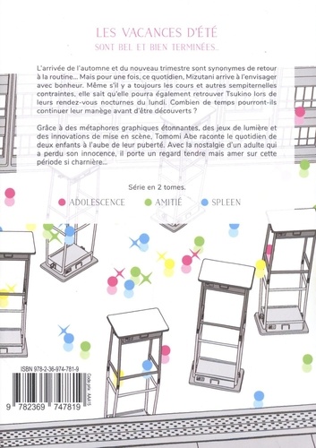 L'arrivée de l'automne et du nouveau trimestre sont synonymes de retour à la routine... Mais pour une fois, ce quotidien, Mizutani arrive à l'envisager avec bonheur. Même s'il y a toujours les cours et autres sempiternelles contraintes, elle sait qu'elle pourra également retrouver Tsukino lors de leurs rendez-vous nocturnes du lundi. Combien de temps pourront-ils continuer leur manège avant d'être découverts ? Grâce à des métaphores graphiques étonnantes, des jeux de lumière et des innovations de mise en scène, Tomomi Abe raconte le quotidien de deux enfants à l'aube de leur puberté. Avec la nostalgie d'un adulte qui a perdu son innocence, il porte un regard tendre mais amer sur cette période si charnière...