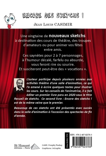Une vingtaine de nouveaux sketchs à destination des cours de théâtre, des troupes d'amateurs ou pour animer vos fêtes entre amis. Ces saynètes pour 2 à 7 personnages, à l'humour décalé, farfelu ou absurde, vous feront rire ou sourire. Et susciteront peut-être des "vocations".