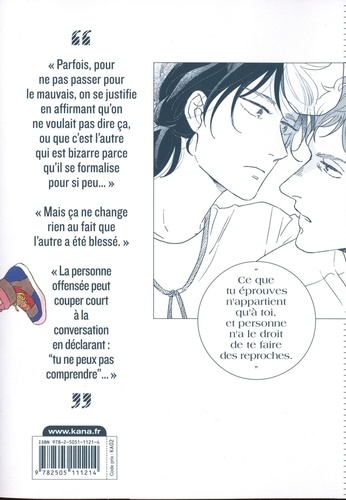 "Parfois, pour ne pas passer pour le mauvais, on se justifie en affirmant qu'on ne voulait pas dire ça, ou que c'est l'autre qui est bizarre parce qu'il se formalise pour si peu..." "Mais ça ne change rien au fait que l'autre a été blessé." "La personne offensée peut couper court à la conversation en déclarant : "tu ne peux pas comprendre..."
