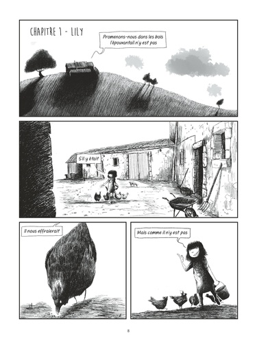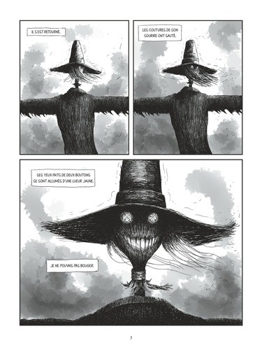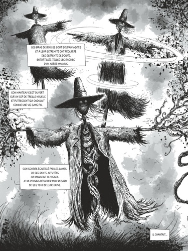 Dans une ferme isolée, Lily, une petite fille au caractère bien affirmé, vit avec son père et sa belle-mère. Elle partage son quotidien entre ses animaux, l'école et un épouvantail planté en haut d'un champ, de l'autre côté de la route. Un épouvantail qui, un jour, se met à lui parler. Les échanges sont houleux, car l'épouvantail se montre vulgaire : il n'a pas besoin d'amis, contrairement à Lily. Le mannequin de paille et de bois lui révèle qu'il a été le témoin d'un tragique accident de voiture sur la route, en bas du champ. Depuis, il a mal au ventre. Le père de Lily a lui aussi été un témoin capital de ce drame : il a pu sauver le passager mais pas la conductrice de la voiture, lorsque la voiture a dévalé le talus pour finir dans l'étang du bois qui jouxte la ferme. Le même étang que celui où est morte la mère de Lily. Tandis qu'une enquête est ouverte pour déterminer les circonstances exactes de l'accident, tous les protagonistes commencent à faire d'étranges cauchemars hantés par la présence singulière... de l'épouvantail. Cette bande dessinée, fruit de la collaboration entre Philippe Pelaez et Stéphane Sénégas, mêle drame et fantastique dans un univers à la Tim Burton. Les illustrations en noir et blanc subliment un récit où la frontière entre rêve et réalité vacille, créant une atmosphère aussi fascinante qu'inquiétante.