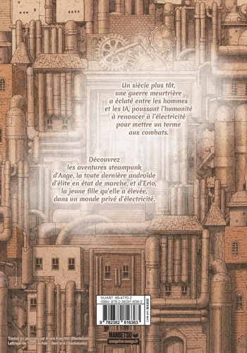 Un siècle plus tôt, une guerre meurtrière a éclaté entre les hommes et les IA, poussant l'humanité à renoncer à l'électricité pour mettre un terme aux combats. Découvrez les aventures steampunk d'Ange, la toute dernière androïde d'élite en état de marche, et d'Erio, la jeune fille qu'elle a élevée, dans un monde privé d'électricité.