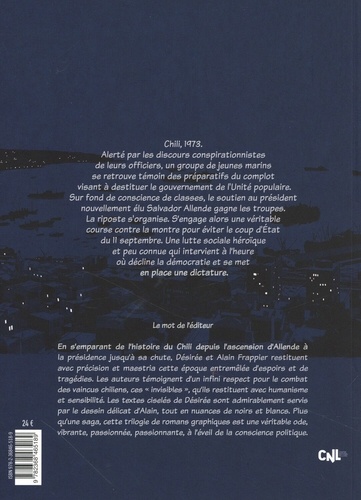 Chili, 1973. Alerté par les discours conspirationnistes de leurs officiers, un groupe de jeunes marins se retrouve témoin des préparatifs du complot visant à destituer le gouvernement de l'Unité populaire. Sur fond de conscience de classes, le soutien au président nouvellement élu Salvador Allende gagne les troupes. La riposte s'organise. S'engage alors une véritable course contre la montre pour éviter le coup d'Etat du 11 septembre. Une lutte sociale héroïque et peu connue qui intervient à l'heure où décline la démocratie et se met en place une dictature. En s'emparant de l'histoire du Chili depuis l'ascension d'Allende à la présidence jusqu'à sa chute, Désirée et Alain Frappier restituent avec précision et maestria cette époque entremêlée d'espoirs et de tragédies. Les auteurs témoignent d'un infini respect pour le combat des vaincus chiliens, ces " invisibles ", qu'ils restituent avec humanisme et sensibilité. Les textes ciselés de Désirée sont admirablement servis par le dessin délicat d'Alain, tout en nuances de noirs et blancs. Plus qu'une saga, cette trilogie de romans graphiques est une véritable ode, vibrante, passionnée, passionnante, à l'éveil de la conscience politique.