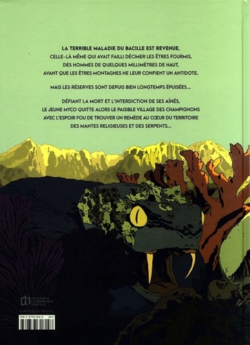 Il y a d'abord eu la puanteur, qui a brutalement remplacé la brise parfumée soufflant habituellement sur la vallée des êtres fourmis, ces hommes de quelques millimètres de haut vivant dans les sous-bois. Puis, la maladie du Bacille s'est répandue comme une traînée de poudre, n'épargnant aucun village endeuillant chaque foyer. C'est au paroxysme de l'épidémie qu'ils sont apparus, immenses salvateurs divins : les êtres montagnes ont donné l'antidote au Prieur Armillaire et ont ainsi sauvé son peuple. Tout le monde connaît cette légende, y compris Myco et sa petite soeur, Paille, qui ont perdu leurs parents dans cette tragédie... Et l'austère Prieur, désormais chef du village des Champignons, s'assure que personne ne l'oublie et que tout un chacun honore dûment les êtres montagnes. Alors quand un étranger portant un masque doté d'un long bec d'oiseau arrive au village et annonce que la maladie est de retour, personne ne veut le croire. Mais Myco, qui voit des premiers stigmates apparaître sur la peau de sa soeur, décide, contre l'avis de tous, de gravir la montagne pour chercher la dernière dose antidote.