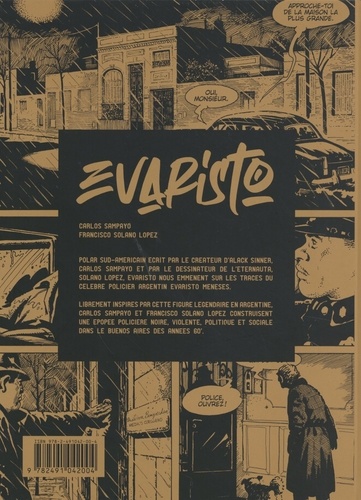 Polar sud-americain écrit par le createur d'Alack Sinner, Carlos Sampayo et par le dessinateur de l'Eternauta, Solano Lopez, Evaristo nous emmènent sur les traces du célèbre policier argentin Evaristo Meneses. Librement inspirés par cette figure légendaire en argentine, Carlos Sampayo et Francisco Solano Lopez construisent une épopée policière noire, violente, politique et sociale dons le Buenos Aires des années 60'.