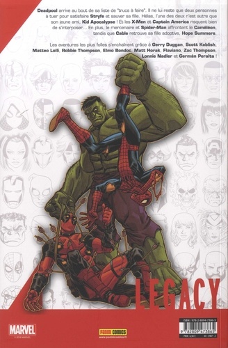 Deadpool arrive au bout de sa liste de "trucs à faire". ll ne lui reste que deux personnes à tuer pour satisfaire Stryfe et sauver sa fille. Hélas, l'une des deux n'est autre que son jeune ami, Kid Apocalypse ! Et les X-Men et Captain America risquent bien de s'interposer... En plus, le mercenaire et Spider-Man affrontent le Caméléon, tandis que Cable retrouve sa fille adoptive, Hope Summers. Les aventures les plus folles s'enchaînent grâce à Gerry Duggan, Scott Koblish, Matteo Lolli, Robbie Thompson, Elmo Bondoc, Matt Horak, Flaviano, Zac Thompson, Lonnie Nadler et Germán Peralta !