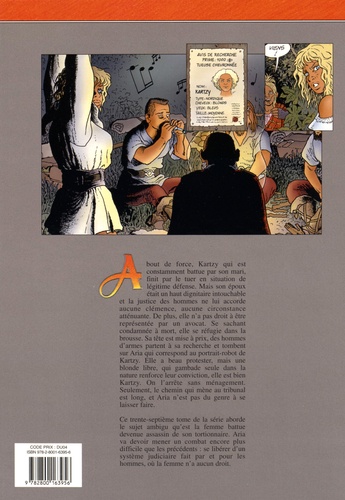 A bout de force, Kartzy qui est constamment battue par son mari, finit par le tuer en situation de légitime défense. Mais son époux était un haut dignitaire intouchable et la justice des hommes ne lui accorde aucune clémence, aucune circonstance atténuante. De plus, elle n'a pas droit à être représentée par un avocat. Se sachant condamnée à mort, elle se réfugie dans la brousse. Sa tête est mise à prix, des hommes d'armes partent à sa recherche et tombent sur Aria qui correspond au portrait-robot de Kartzy. Elle a beau protester, mais une blonde libre, qui gambade seule dans la nature renforce leur conviction, elle est bien Kartzy. On l'arrête sans ménagement. Seulement, le chemin qui mène au tribunal est long, et Aria n'est pas du genre à se laisser faire. Ce trente-septième tome de la série aborde le sujet ambigu qu'est la femme battue devenue assassin de son tortionnaire. Aria va devoir mener un combat encore plus difficile que les précédents : se libérer d'un système judiciaire fait par et pour les hommes, où la femme n'a aucun droit.