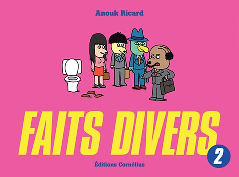 On imagine volontiers Anouk Ricard s'attabler chaque matin au bistro du coin devant un café, pour y dépouiller Sud Ouest ou Les Dernières Nouvelles d'Alsace et traquer, entre concours de pétanque et commémorations diverses, le crime crétin et le drame dérisoire. Sa fantaisie se met alors au travail. Elle fait dérailler l'anecdote, l'envoie balader sur les chemins de traverse de la réalité, à la rencontre d'une conclusion, lamentable et loufoque dans sa logique même. Ces histoires courtes retrouvent l'humour anarchiste des récits en trois lignes de Félix Fénéon ou des détournements de Gabriel de Lautrec, basés eux aussi sur les faits divers. La ménagerie de l'artiste peut sembler enfantine. Méfiez-vous des apparences. Le canard bleu, le cheval jaune ou le chien myope renvoient l'image d'une humanité mesquine, ridicule et pas au mieux de sa forme. Aussi empotés que décalés, les personnages de Faits divers prouvent de façon hilarante que le crime ne paie pas, du moins s'il est commis par des imbéciles.
