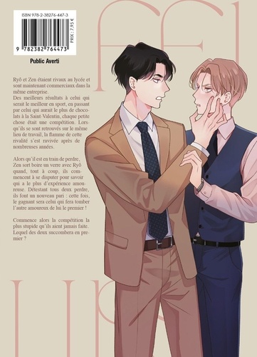 Ryô et Zen étaient rivaux au lycée et sont maintenant commerciaux dans la même entreprise. Des meilleurs résultats à celui qui serait le meilleur en sport, en passant par celui qui aurait le plus de chocolats à la Saint-Valentin, chaque petite chose était une compétition. Lorsqu'ils se sont retrouvés sur le même lieu de travail, la flamme de cette rivalité s'est ravivée après de nombreuses années. Alors qu'il est en train de perdre, Zen sort boire un verre avec Ryô quand, tout à coup, ils commencent à se disputer pour savoir qui a le plus d'expérience amoureuse. Détestant tous deux perdre, ils font un nouveau pari : cette fois, le gagnant sera celui qui fera tomber l'autre amoureux de lui le premier ! Commence alors la compétition la plus stupide qu'ils aient jamais faite. Lequel des deux succombera en premier ?