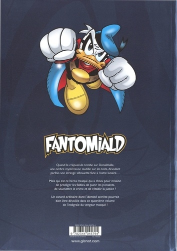 Quand le crépuscule tombe sur Donaldville, une ombre mystérieuse sautille sur les toits, dévoilant parfois son étrange silhouette face à l'astre lunaire... Mais qui est ce héros masqué qui a choisi pour mission de protéger les faibles, de punir les puissants, de soumettre le crime et de rétablir la justice ? Un canard ordinaire dont l'identité secrète pourrait bien être dévoilée dans ce quatrième volume de l'intégrale du vengeur masqué !