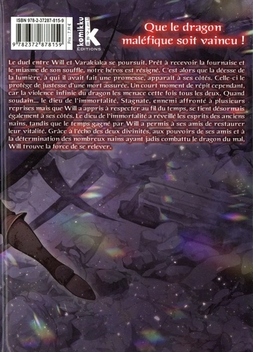 Percez les mystères d'un monde où les mots de la création renferment les secrets de la magie ! Le duel entre Will et Varakiaka se poursuit. Prêt à recevoir la fournaise et le miasme de son souffle, notre héros est résigné. C'est alors que la déesse de la lumière, à qui il avait fait une promesse, apparaît à ses côtés. Celle-ci le protège de justesse d'une mort assurée. Un court moment de répit cependant, car la violence infinie du dragon les menace cette fois tous les deux. Quand soudain... le dieu de l'immortalité, Stagnate, ennemi affronté à plusieurs reprises mais que Will a appris à respecter au fil du temps, se tient désormais également à ses côtés. Le dieu de l'immortalité a réveillé les esprits des anciens nains, tandis que le temps gagné par Will a permis à ses amis de restaurer leur vitalité. Grâce à l'écho des deux divinités, aux pouvoirs de ses amis et à la détermination des nombreux nains ayant jadis combattu le dragon du mal, Will trouve la force de se relever.
