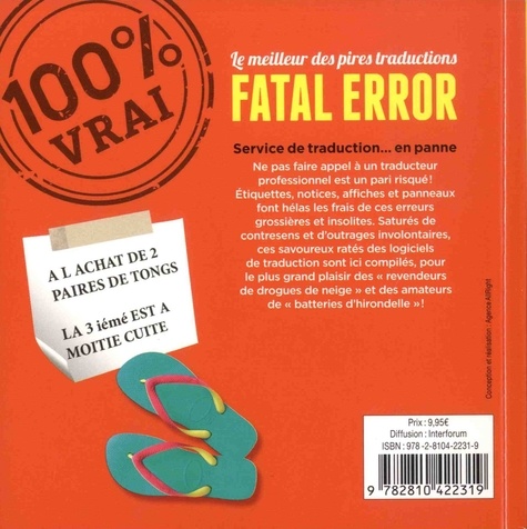 Ne pas faire appel à un traducteur professionnel est un pari risqué ! Etiquettes, notices, affiches et panneaux font hélas les frais de ces erreurs grossières et insolites. Saturés de contresens et d'outrages involontaires, ces savoureux ratés des logiciels de traduction sont ici compilés, pour le plus grand plaisir des "revendeurs de drogues de neige" et des amateurs de "batteries d'hirondelle "!