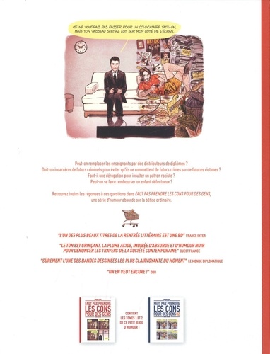 Peut-on remplacer les enseignants par des distributeurs de diplômes ? Doit-on incarcérer de futurs criminels pour éviter qu'ils ne commettent de futurs crimes sur de futures victimes ? Faut-il une dérogation pour insulter un patron raciste ? Peut-on se faire rembourser un enfant défectueux ? Retrouvez toutes les réponses à ces questions dans Faut pas prendre les cons pour des gens, une série d'humour absurde sur la bêtise ordinaire.