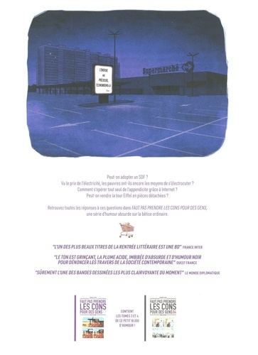 Les tomes 3 et 4 de la série à succès Faut pas prendre les cons pour des gens réunis en un coffret toujours plus cynique et hilarant ! Le cadeau idéal pour toute personne aimant rire de la bêtise ordinaire. Après deux années de travail à manipuler la mécanique de l'absurde pour mieux tordre les clichés de notre société, Emmanuel Reuzé approfondit son analyse de la bêtise humaine avec ces deux derniers tomes de la série à succès Faut pas prendre les cons pour des gens, réunis pour la première fois en coffret ! Reuzé aborde par l'absurde de grands sujets de société tels que l'enseignement, la pauvreté, le racisme ordinaire, l'intelligence artificielle, la radicalisation, le dopage, l'eugénisme, le harcèlement publicitaire, la corrida, les services après vente, les déserts médicaux... Chaque gag est construit avec intelligence, dans un style réaliste dont la répétition de cases creuse le décalage comique entre dialogues et situations.
