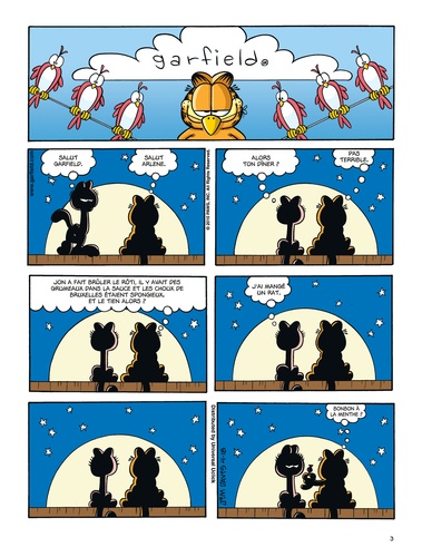 Ce cinquante-huitième épisode des aventures du chat le plus célèbre de la bande dessinée nous le montre sous un jour inattendu : celui d'un tendre romantique… Car si Garfield aime manger, dormir et zapper ; s'il aime également embêter Jon, martyriser Odie et tuer les araignées, Garfield aime aussi la gracieuse Arlene, avec laquelle il forme probablement le couple le plus glamour de la bande dessinée. 58e volet des aventures de Garfield, une série pour rire en famille, avec ou sans chat !